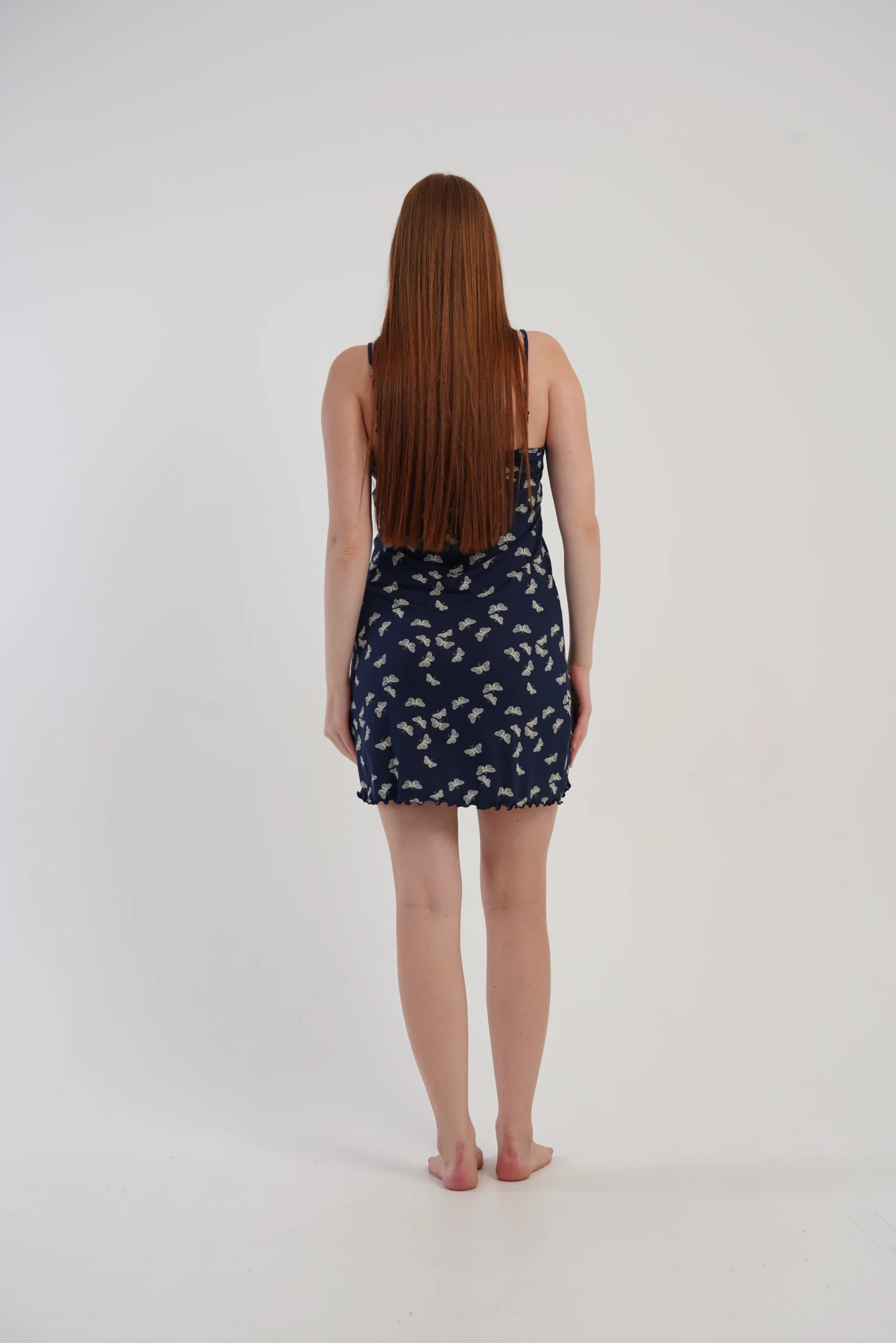 • Stylowy granatowy kolor ozdobiony delikatnym wzorem jasnych motylków