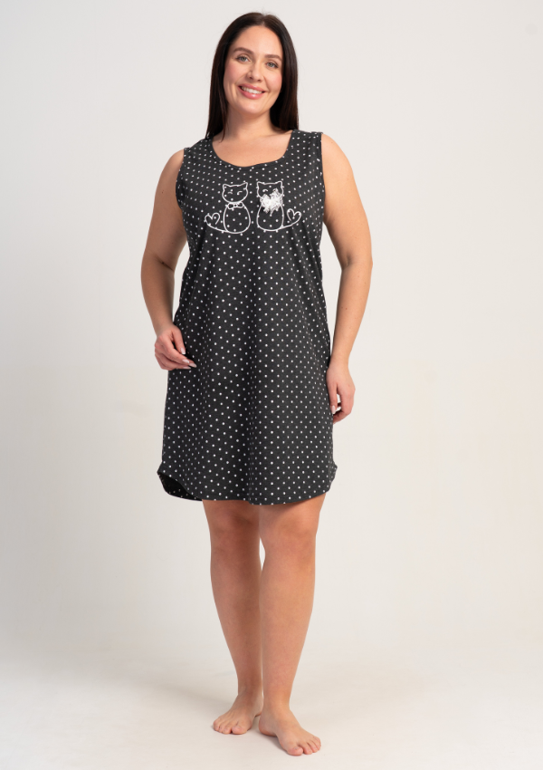 • Całość w drobne groszki z nadrukiem kotów na piersi