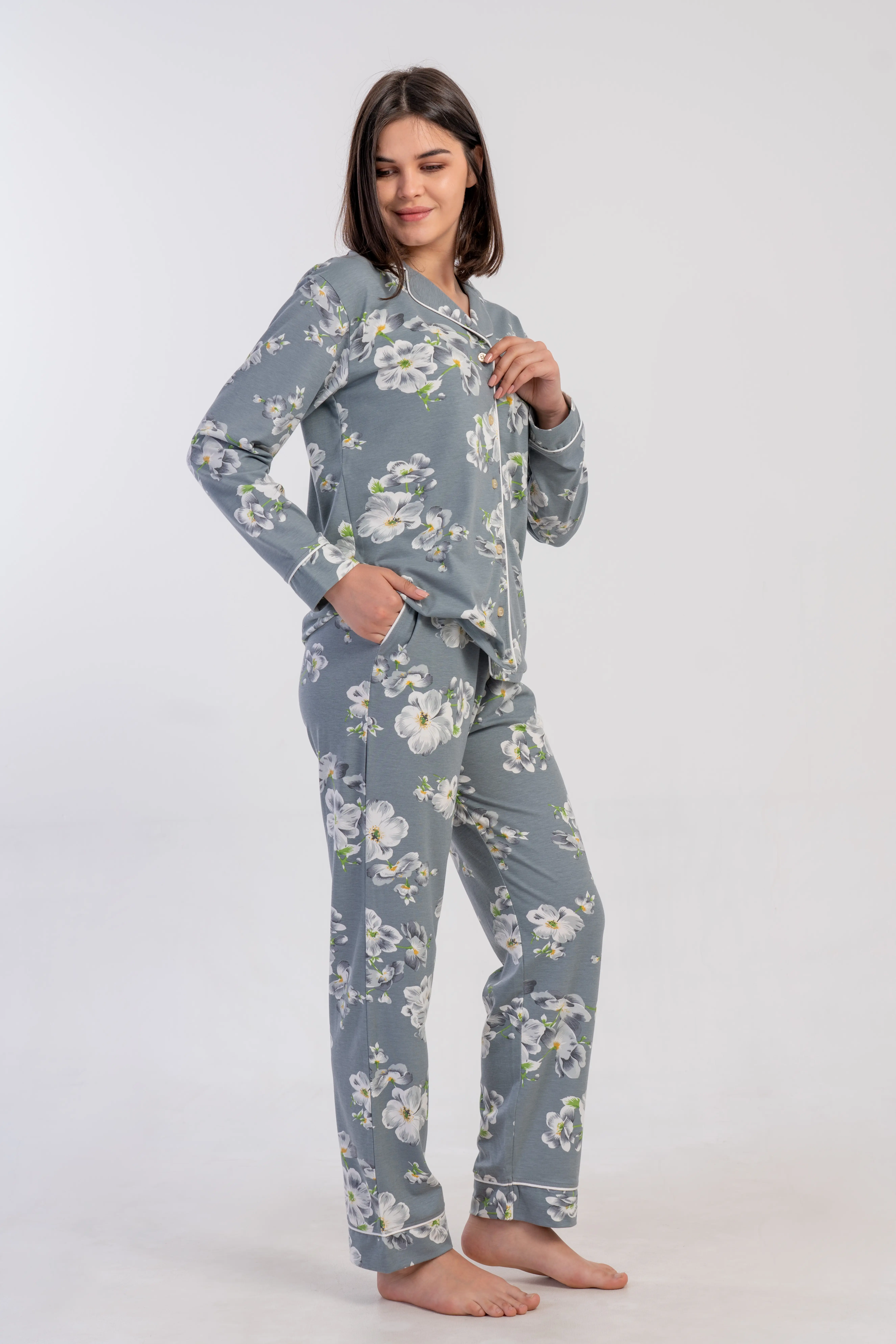 • Stylowa, dwuczęściowa piżama damska z długim rękawem i długimi spodniami