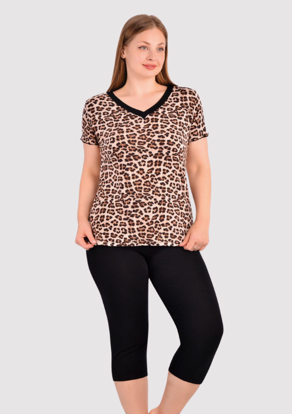 • Dwuczęściowa piżama damska: koszulka z krótkim rękawem + spodnie 3/4 (capri)
