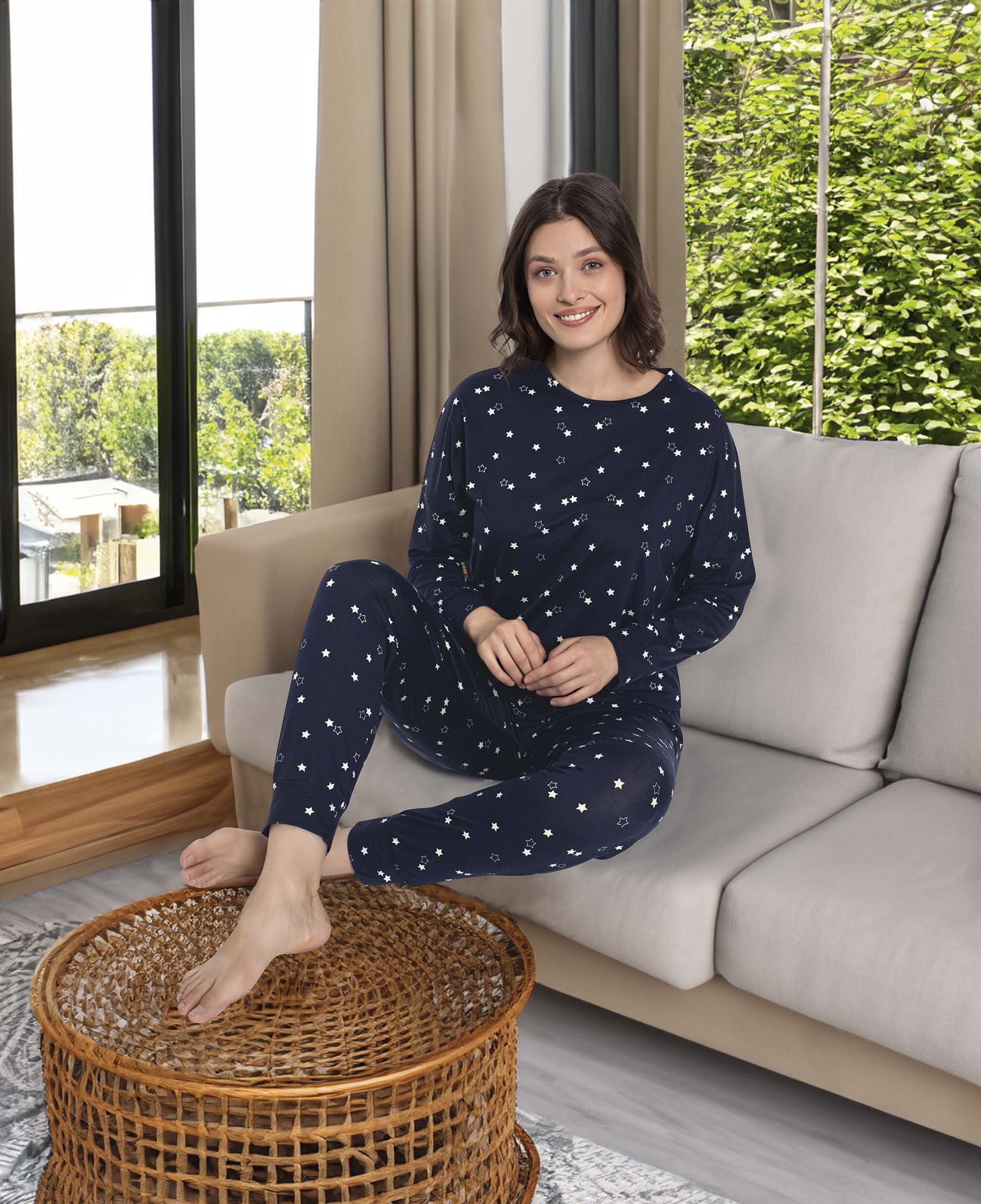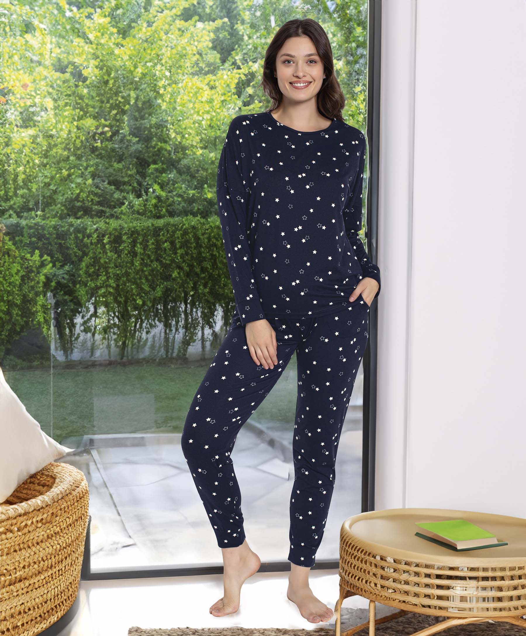 • Stylowa, dwuczęściowa piżama damska z długim rękawem i długimi spodniami