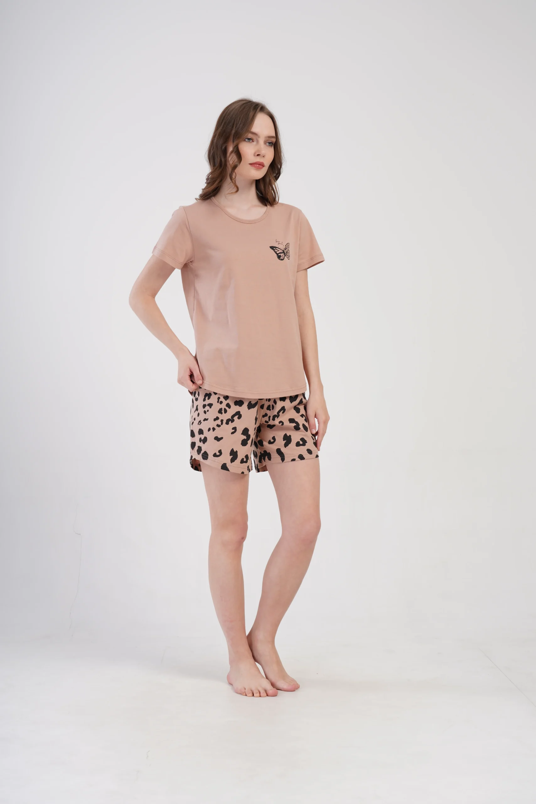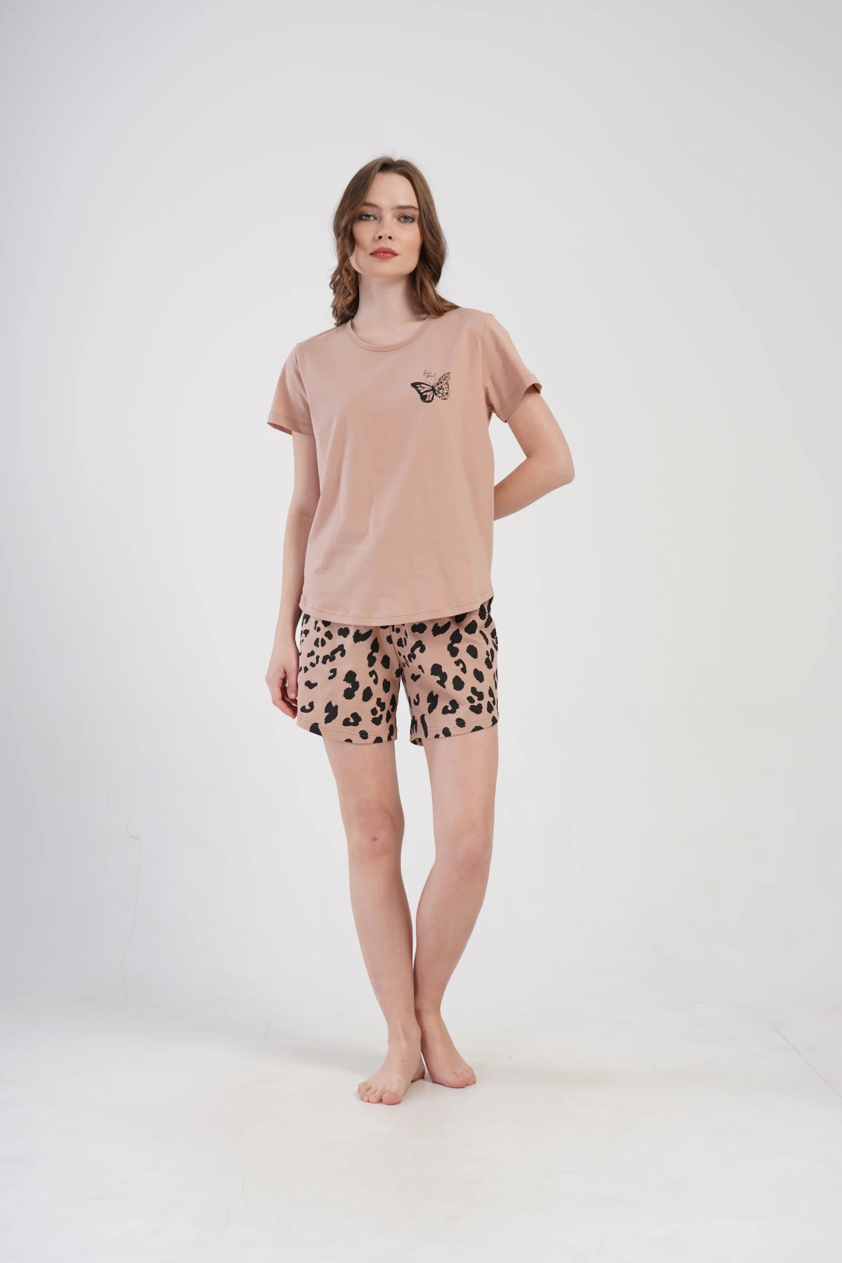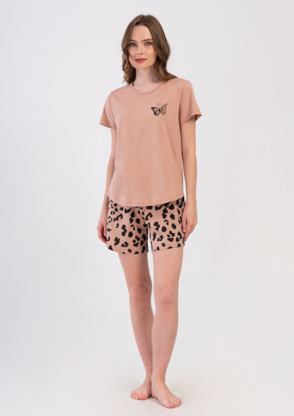 • Krótkie spodenki w modny panterkowy wzór, świetnie komponujące się z gładką górą