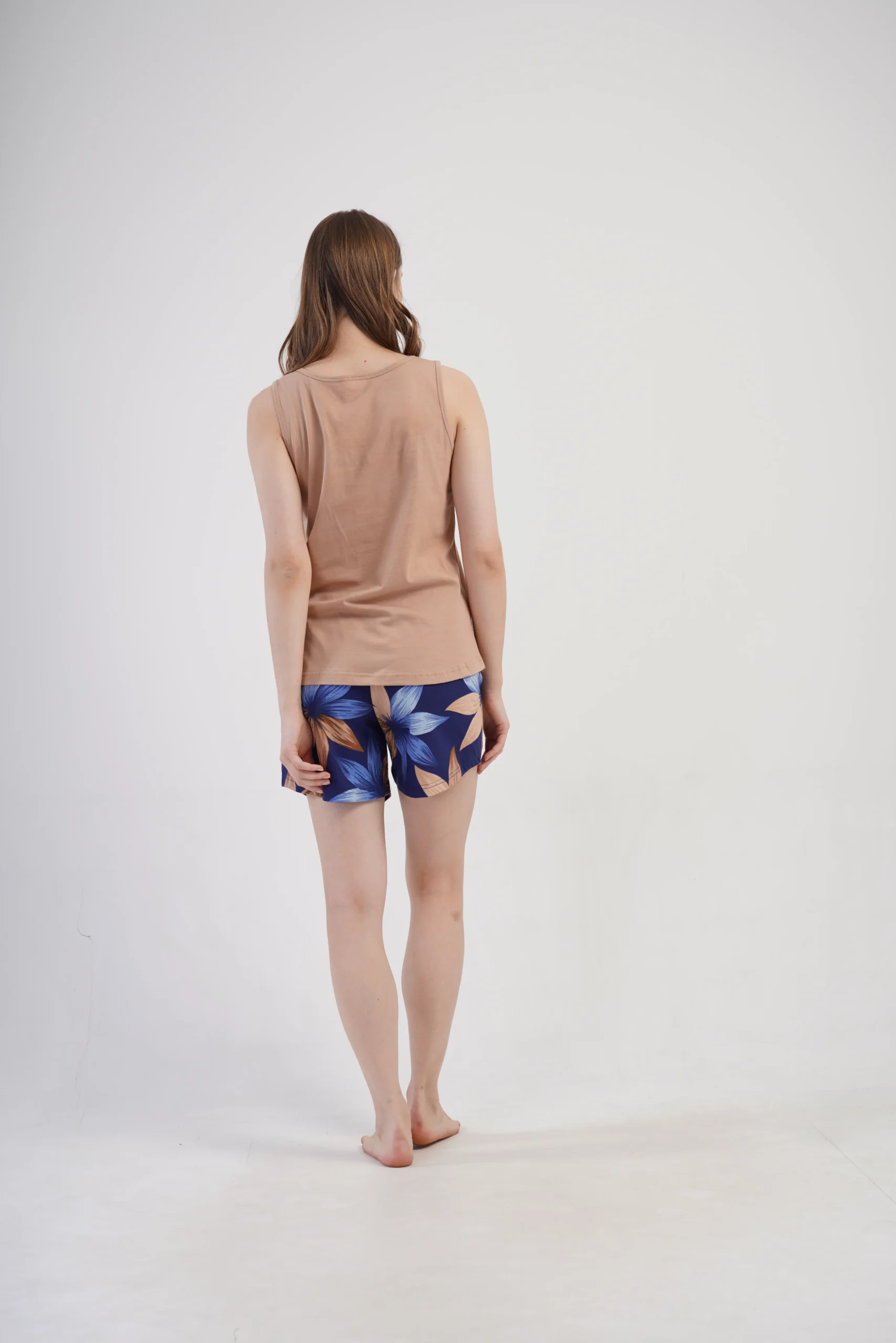 karmelowy top + granatowe szorty w beżowo-niebieskie kwiaty