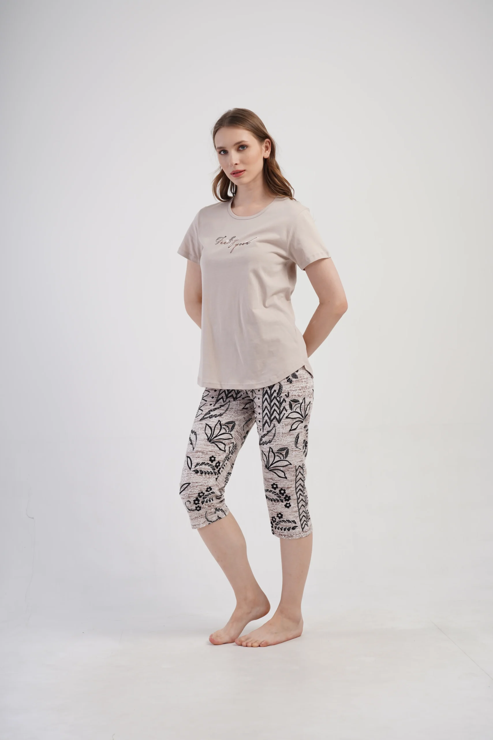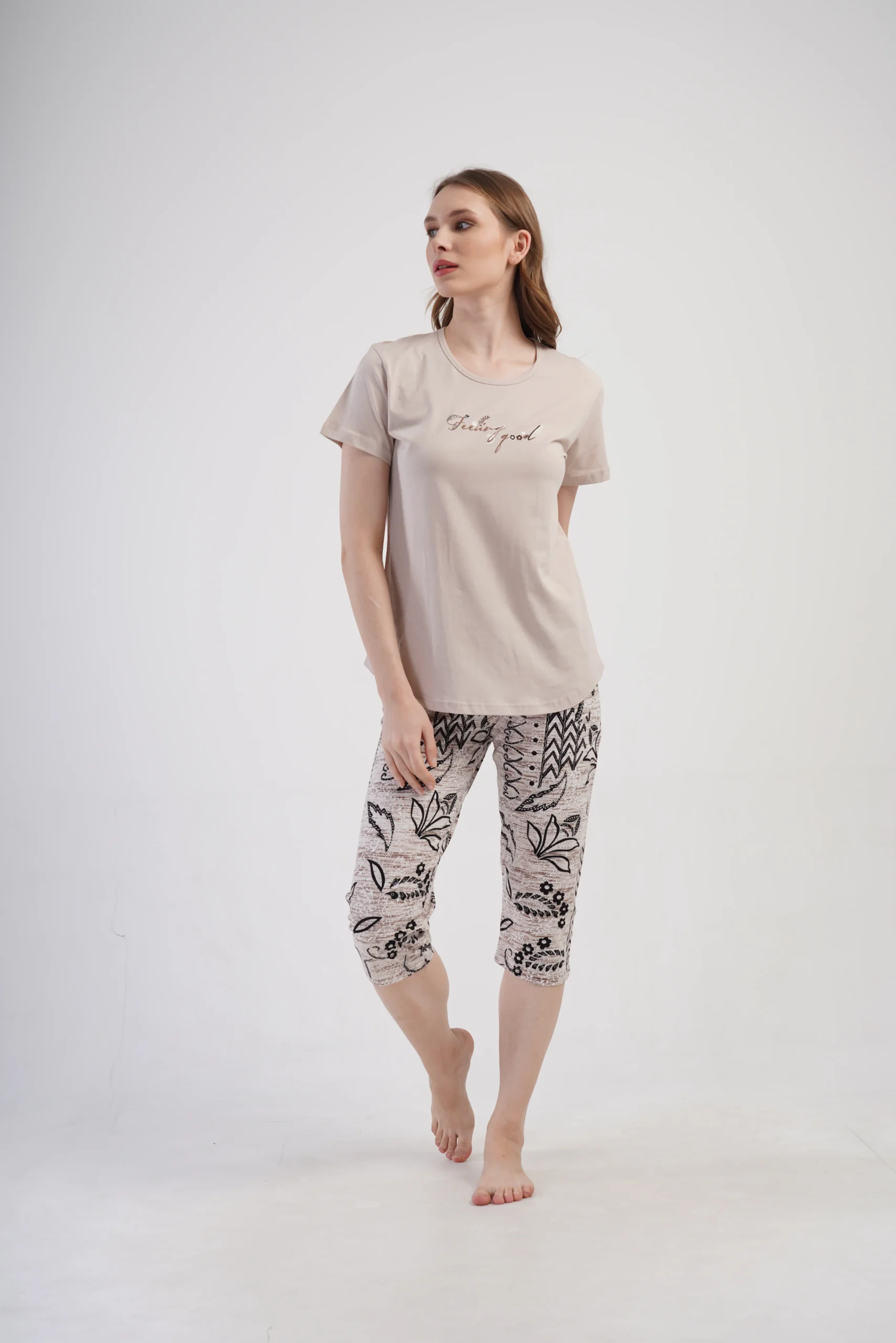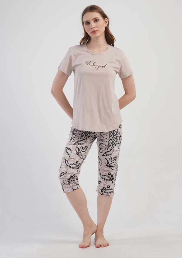 • Subtelny napis na koszulce oraz dekoracyjny, roślinny wzór na spodniach tworzą spójną i stylową całość