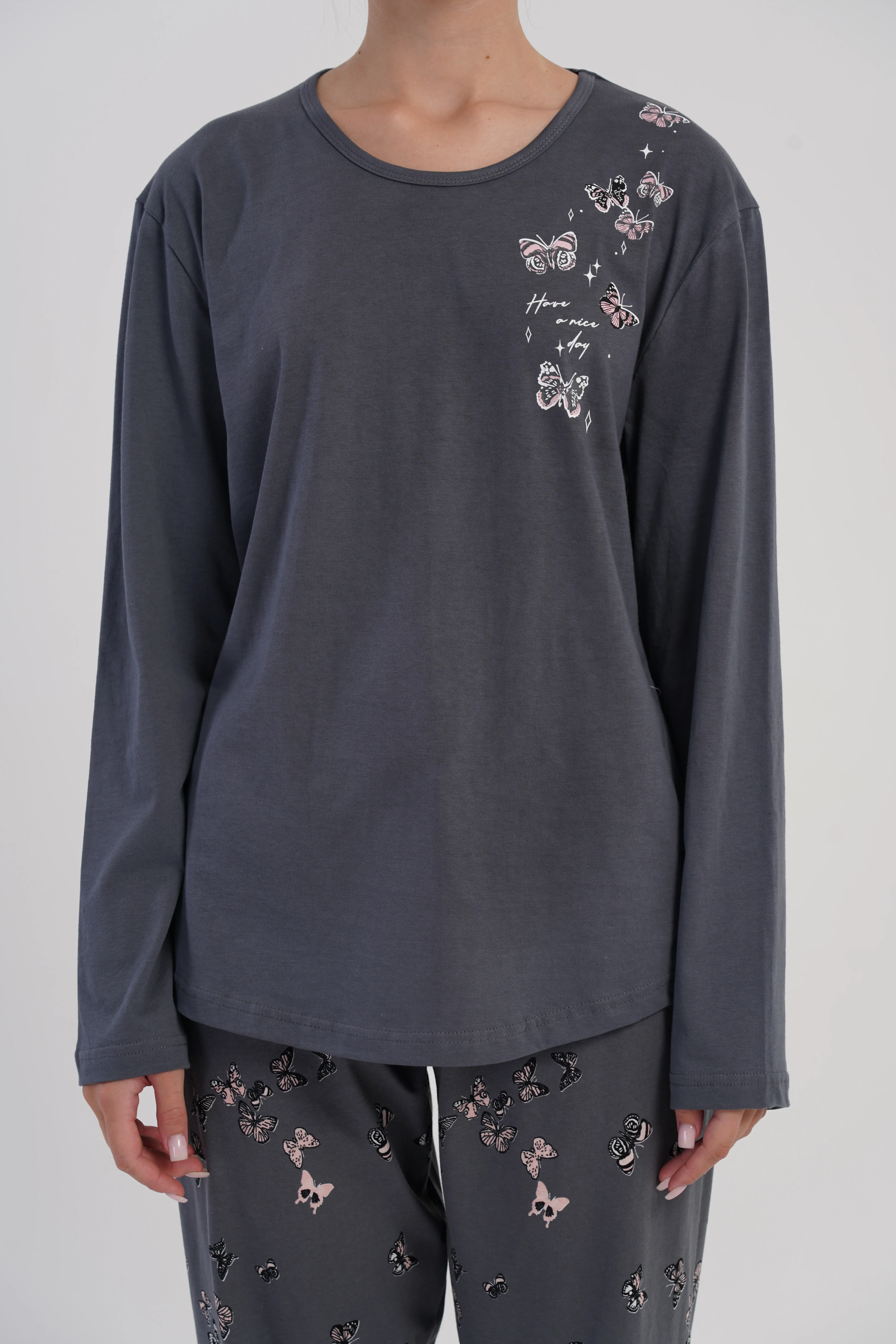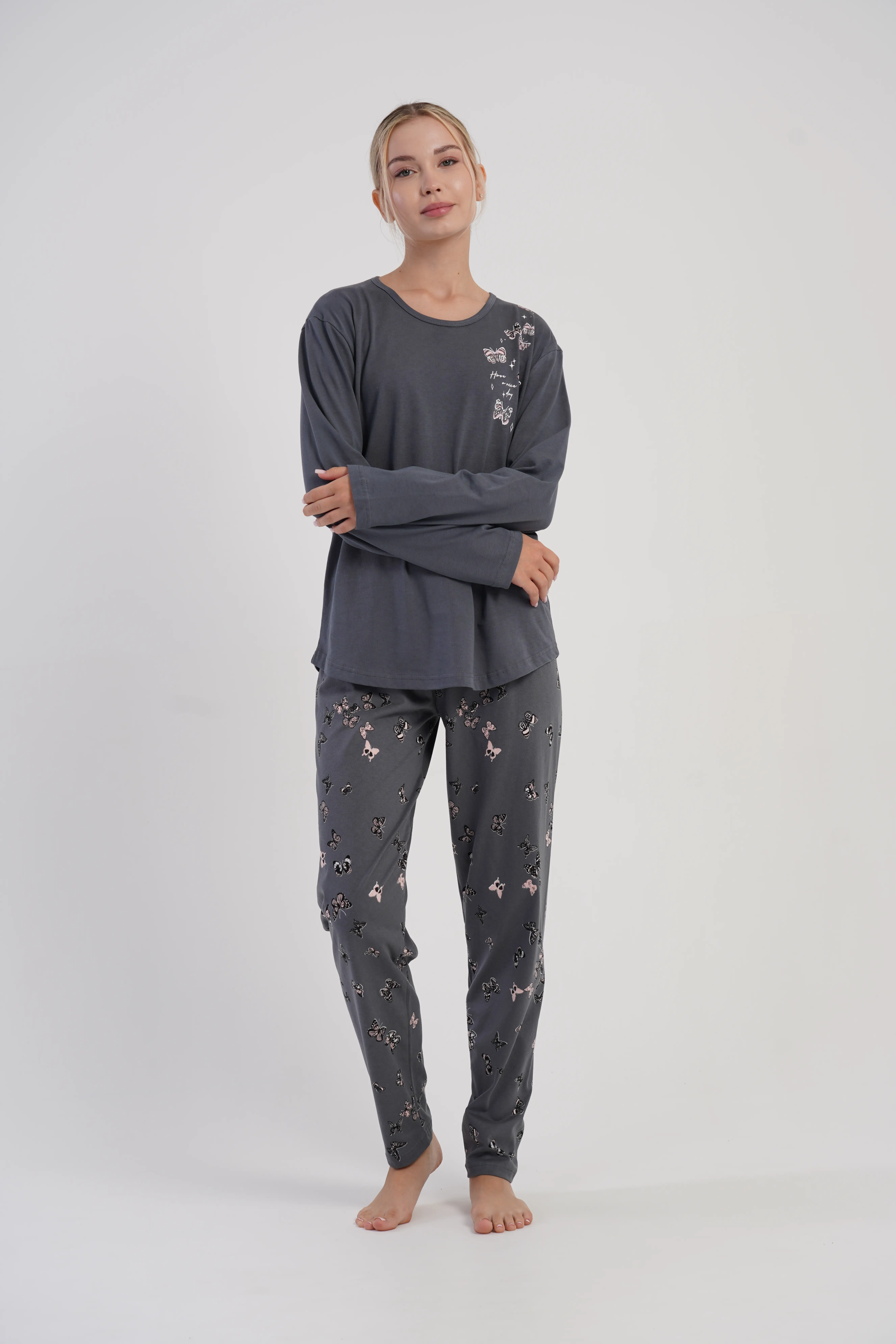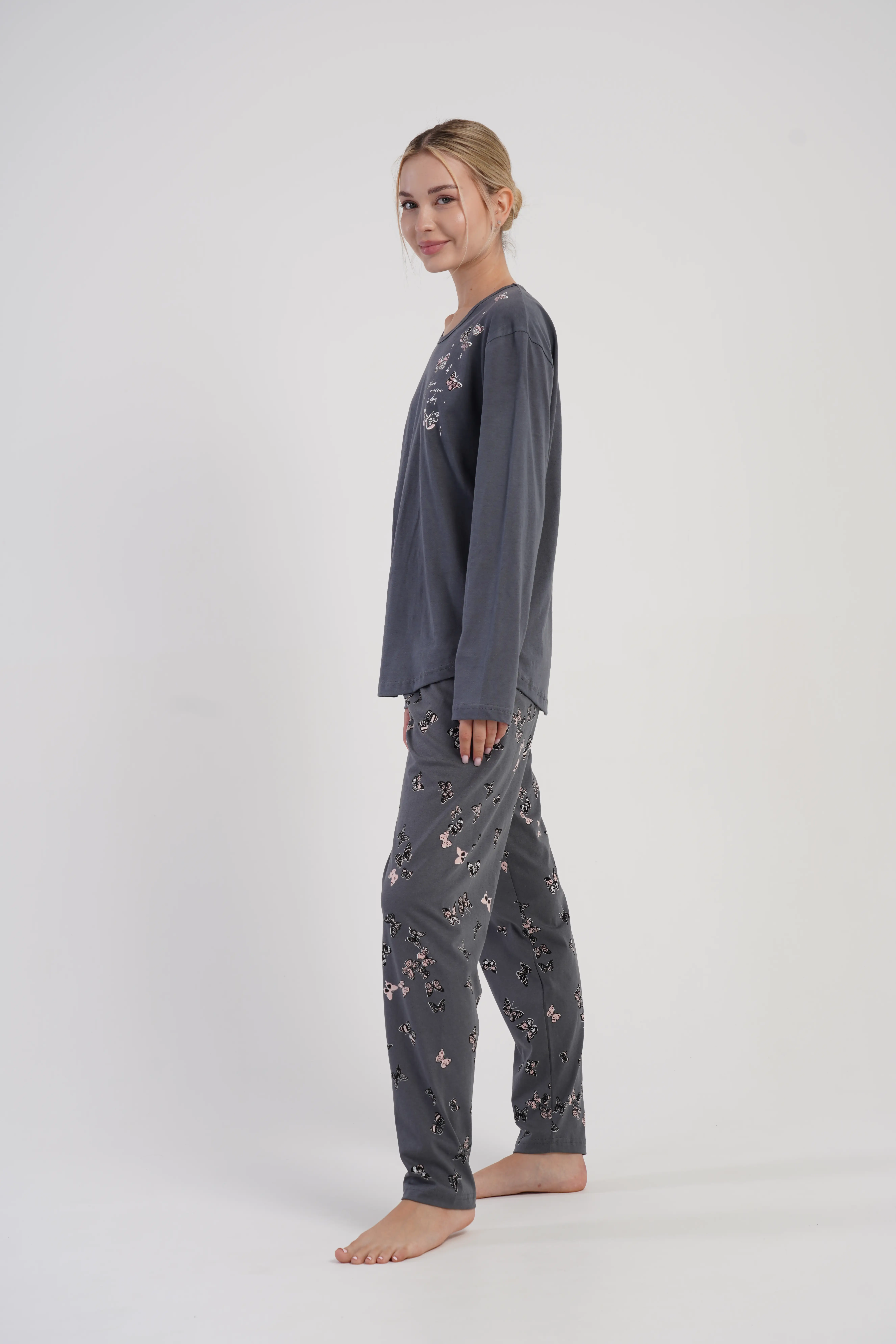 • Spodnie w ciemnoszarym kolorze z dopasowanym wzorem w motyle, tworzą elegancki i spójny komplet