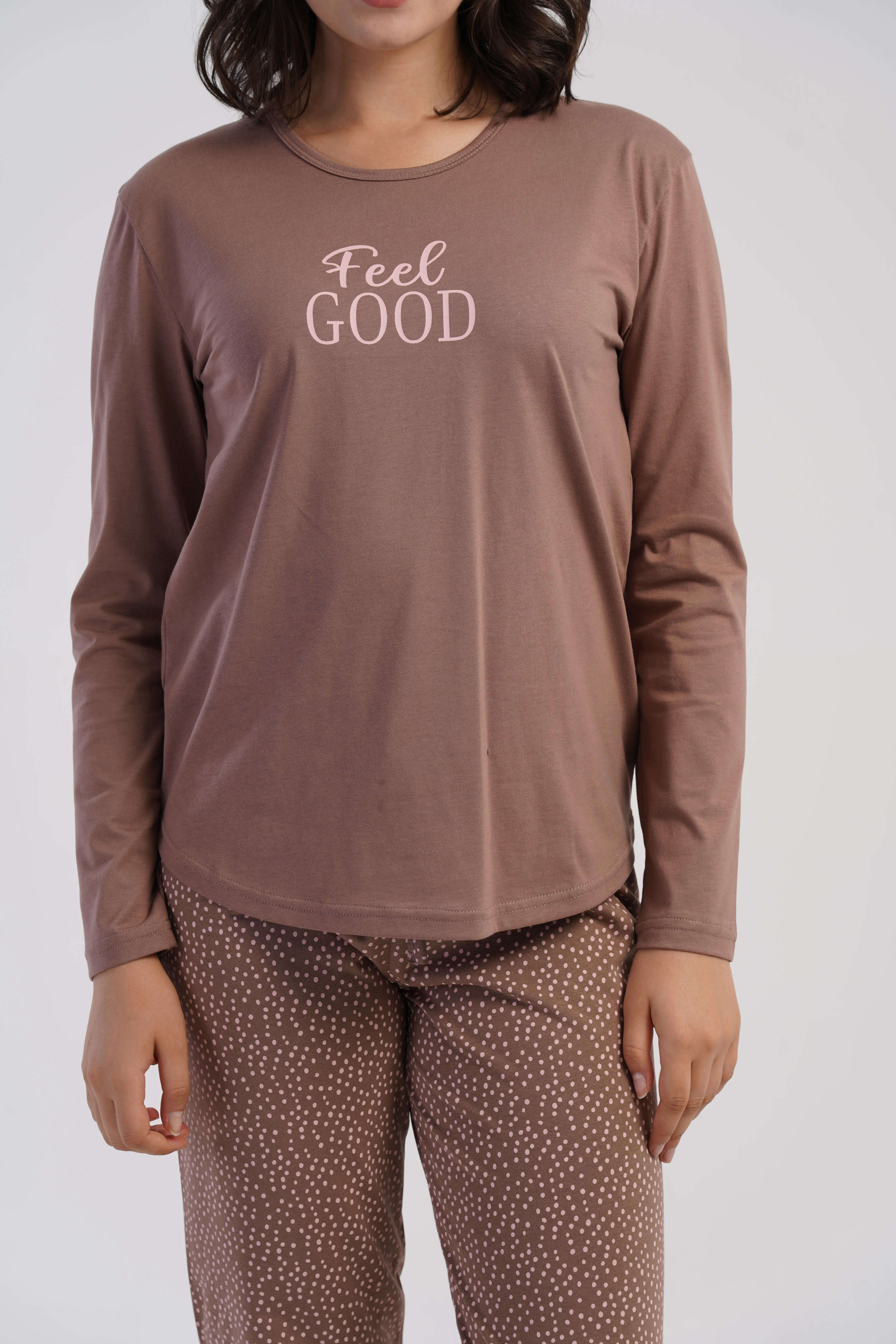 • Bluza z długim rękawem i napisem „Feel Good” na przodzie – dostępna w dwóch wersjach kolorystycznych: brązowej i pudrowo-różowej