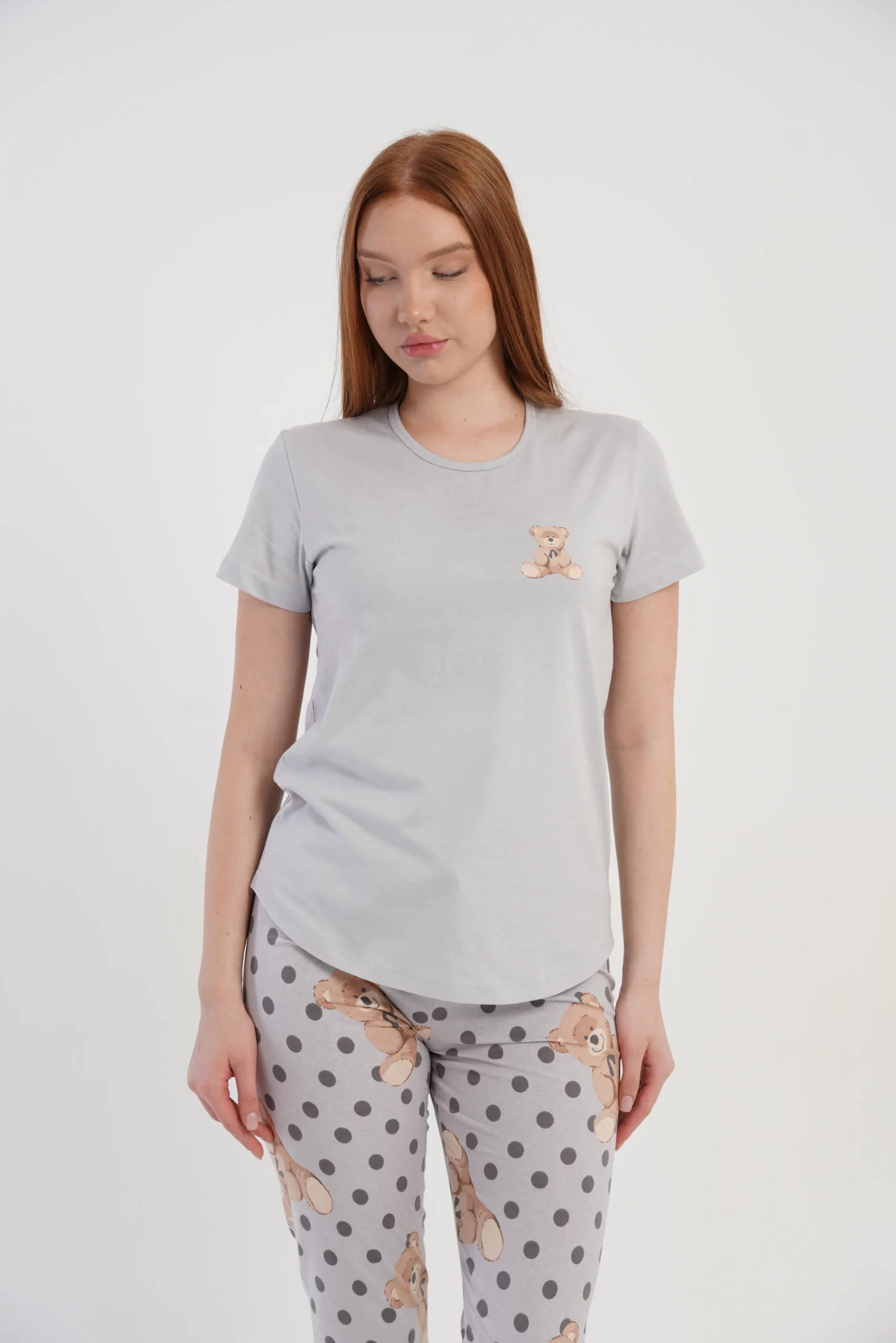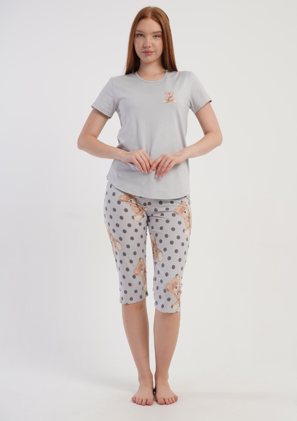 • jasnoszara koszulka + szare spodnie 3/4 w grochy i misie