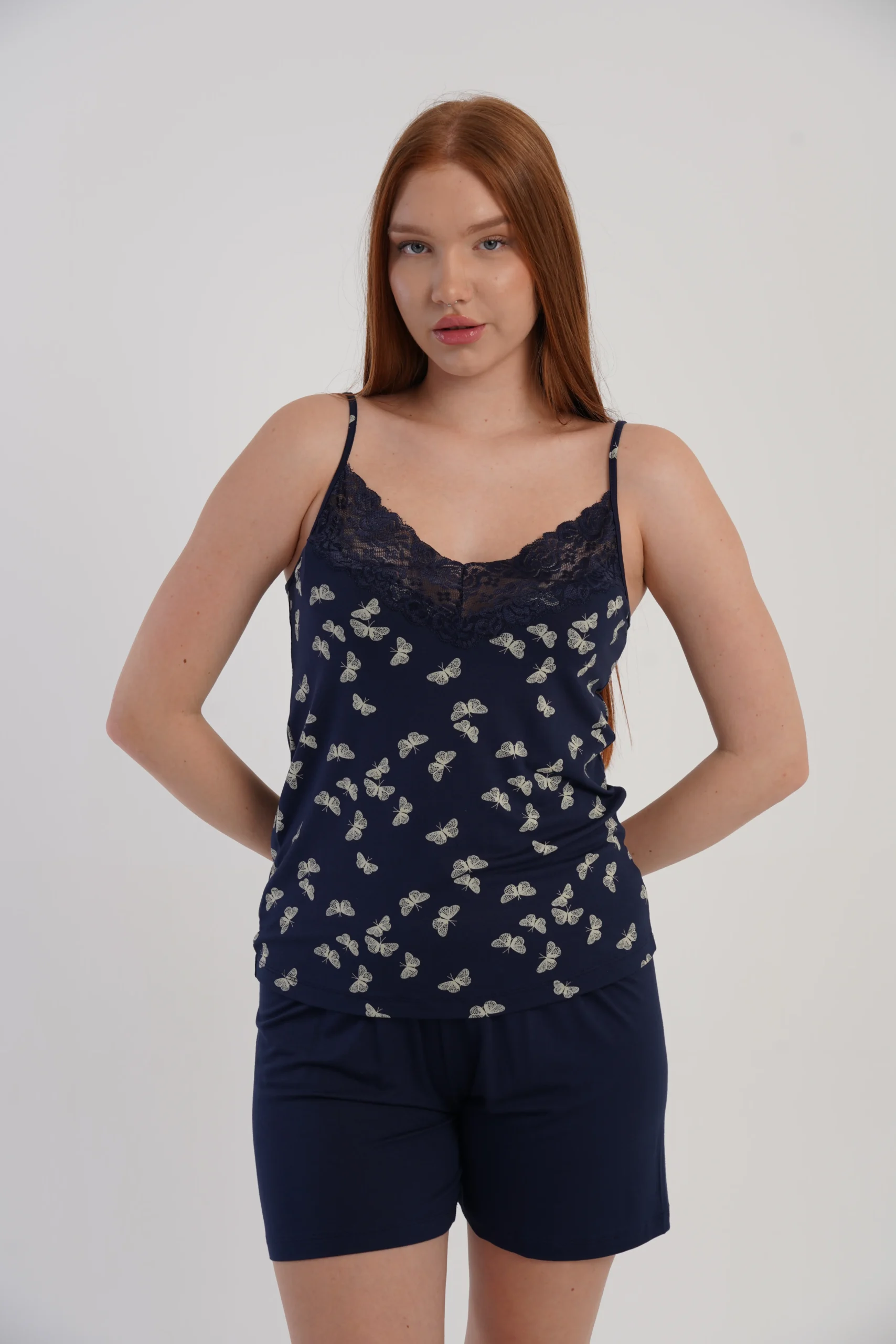 • Subtelny wzór drobnych motylków na granatowym tle dodaje całości delikatnego, dziewczęcego charakteru