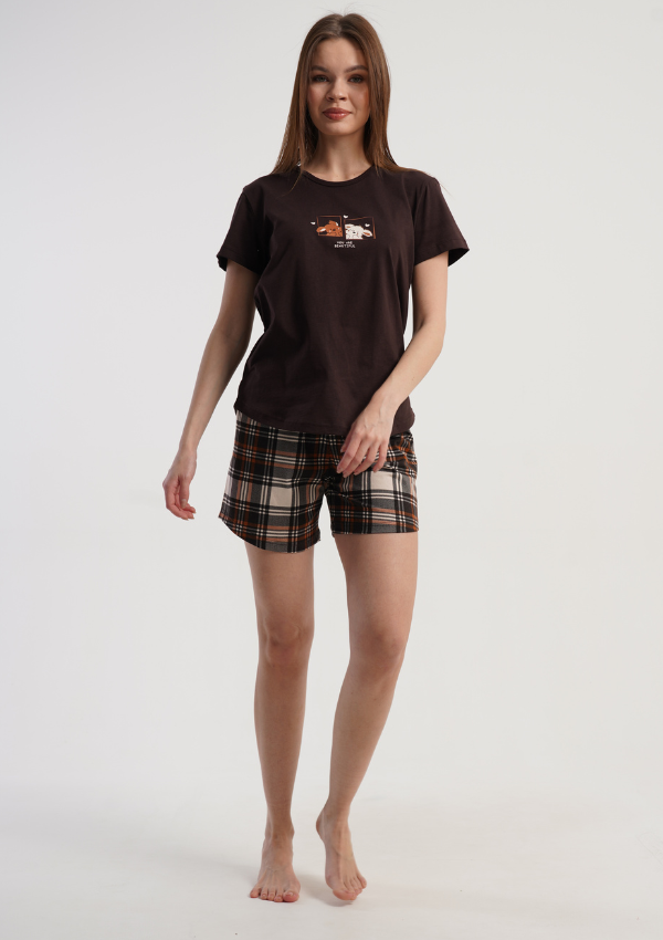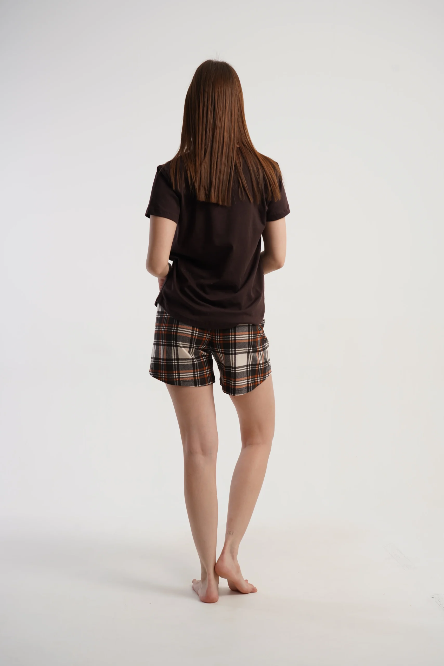 koszulka brązowa, spodenki w kratę beżowo-brązową