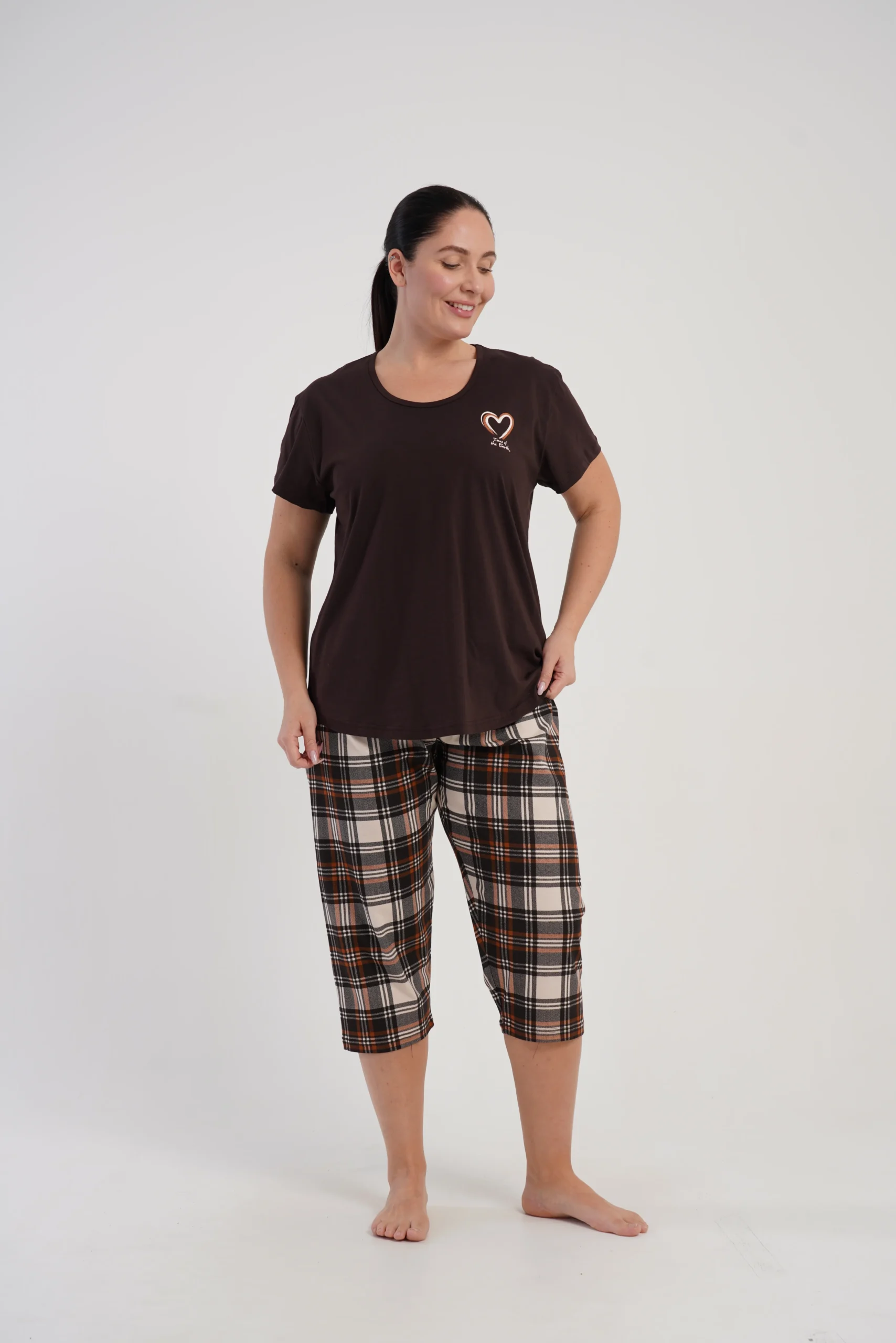 koszulka brązowa, spodnie w kratę beżowo-brązową