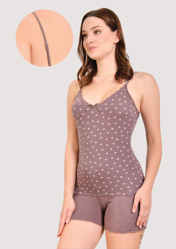 • Komplet składający się z koszulki na cienkich, regulowanych ramiączkach oraz krótkich spodenek