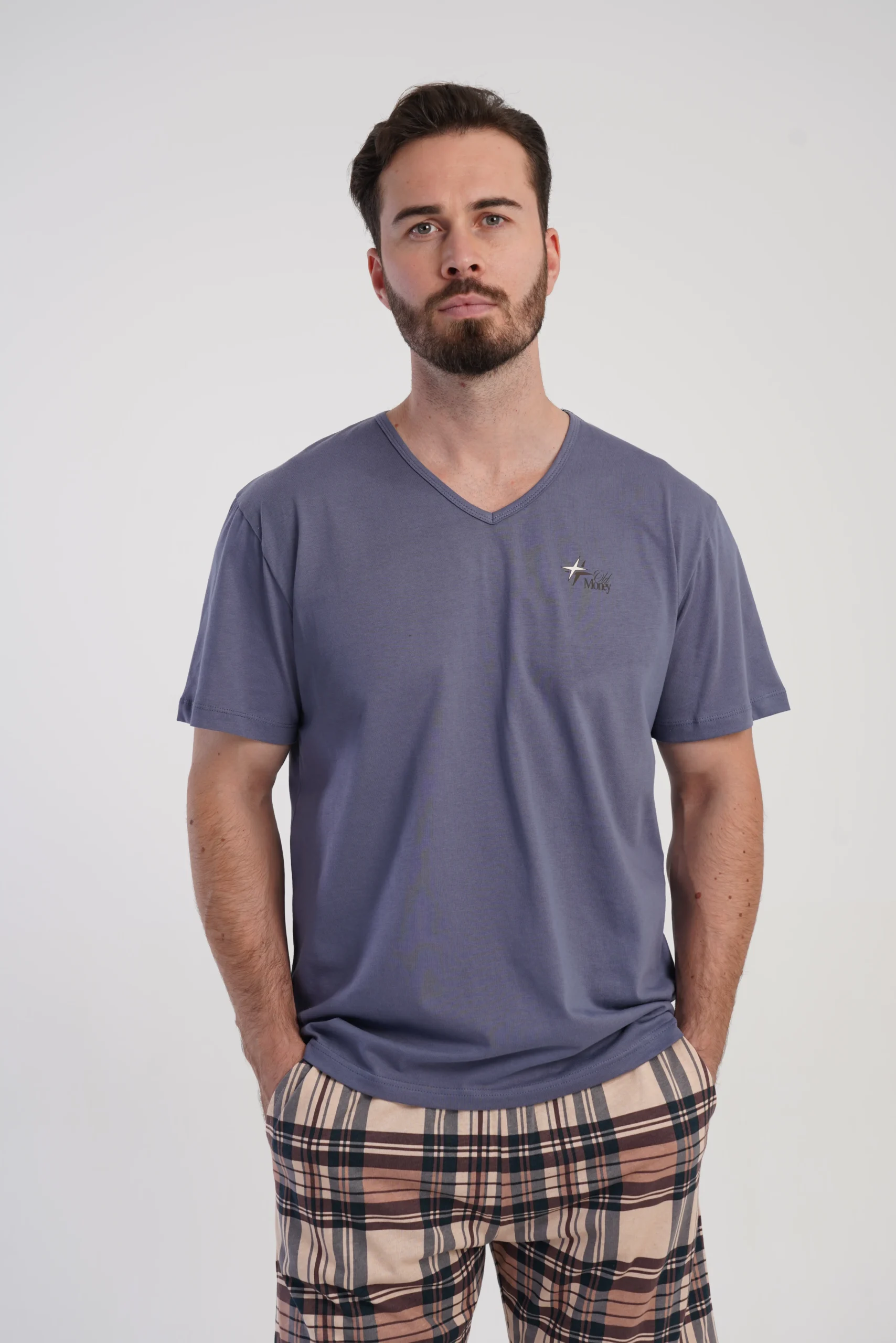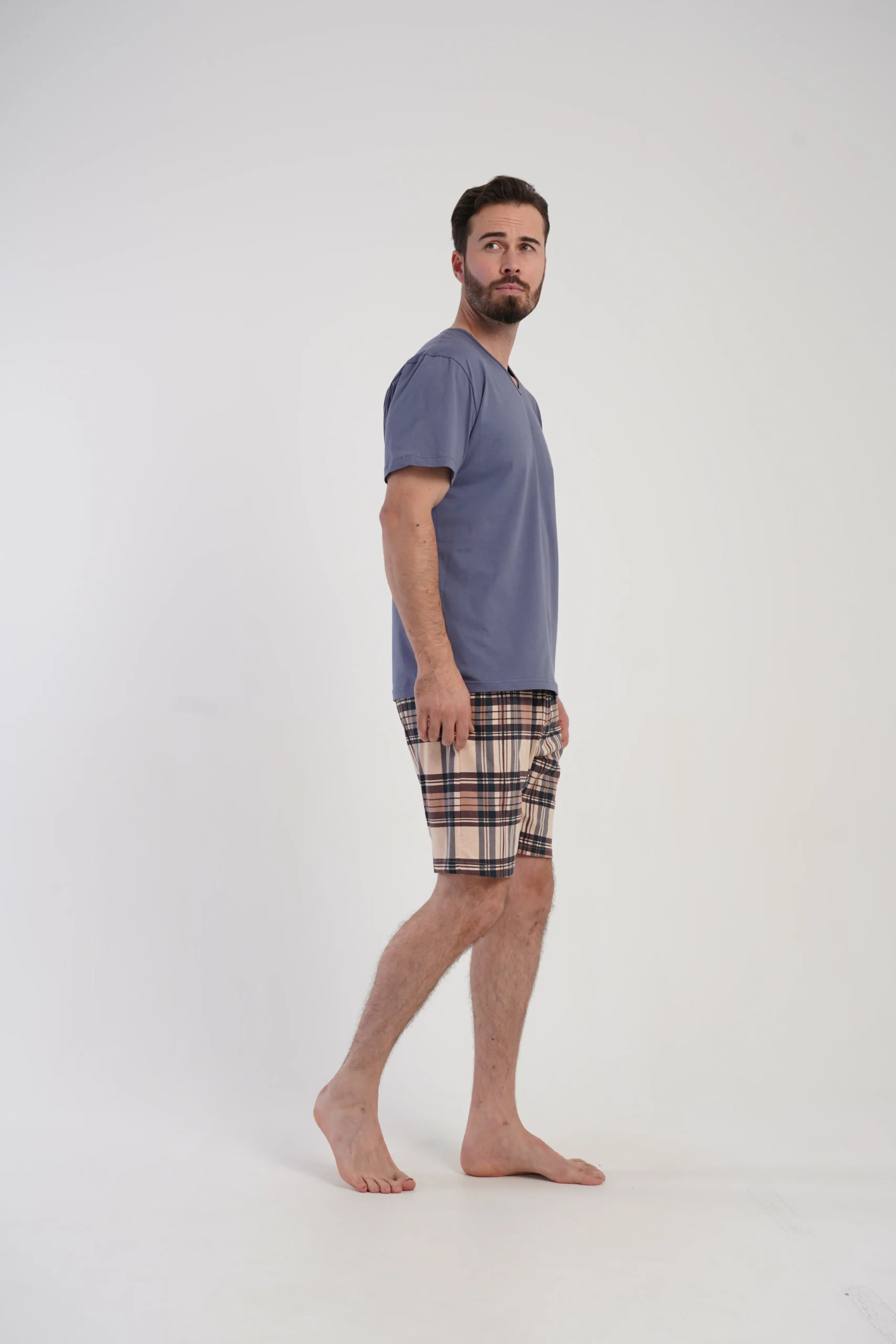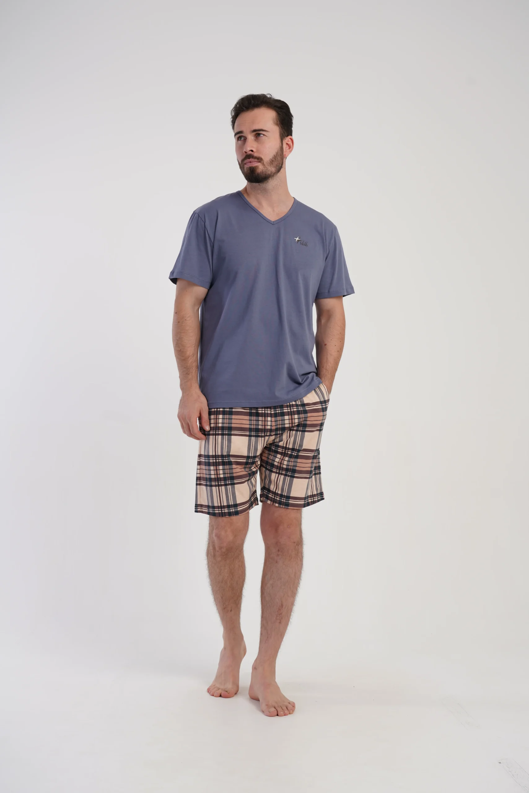koszulka niebiesko-szara, spodenki w kratę beżowo-brązową