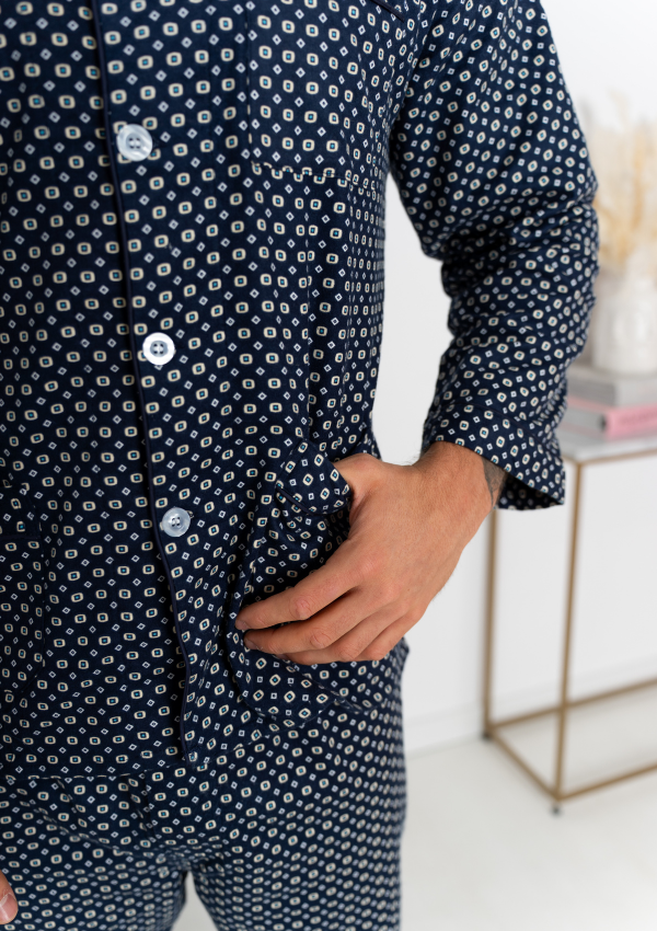 • Tkanina o ciemnym tle i drobnym, eleganckim wzorze, idealna dla mężczyzn ceniących klasykę i wygodę