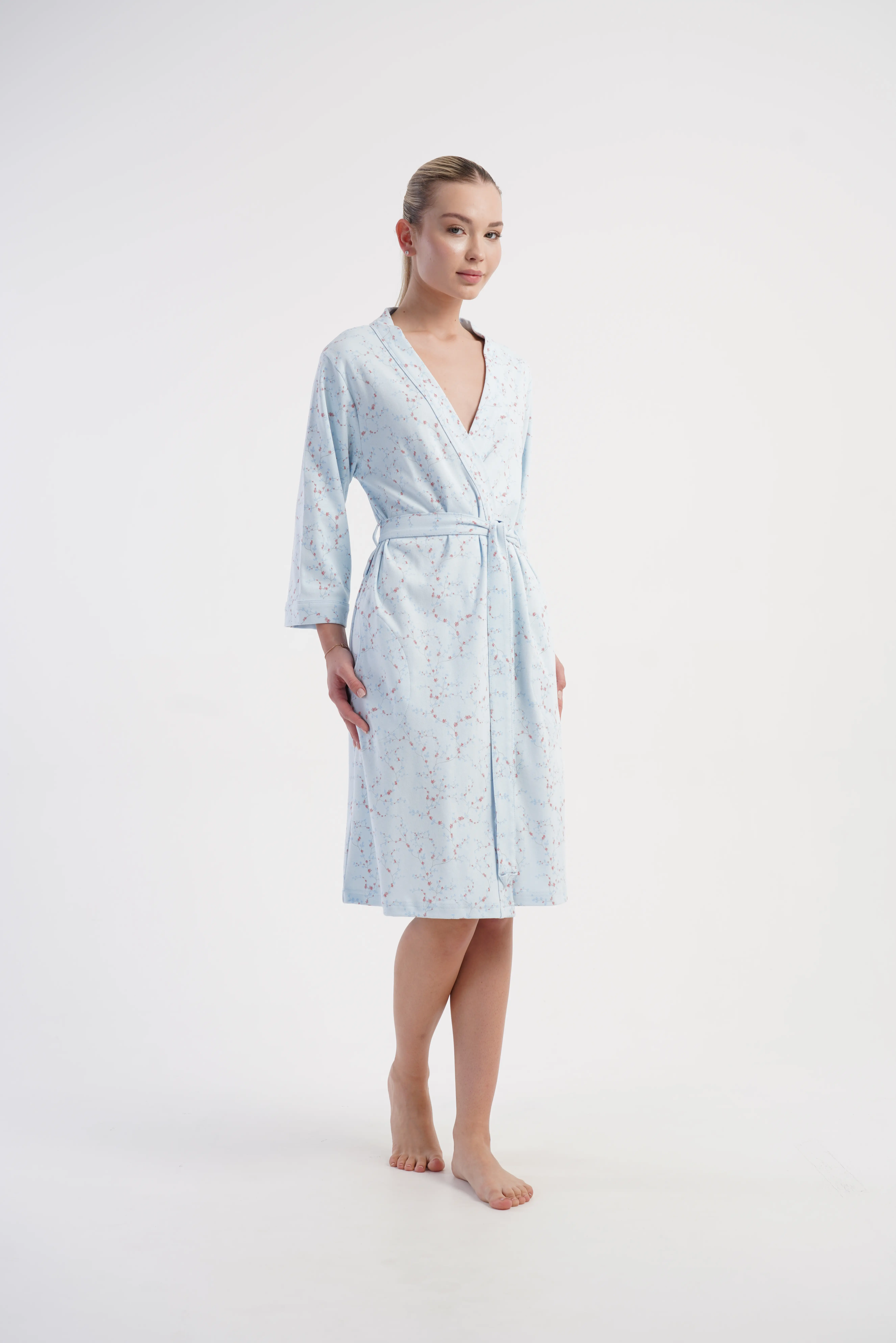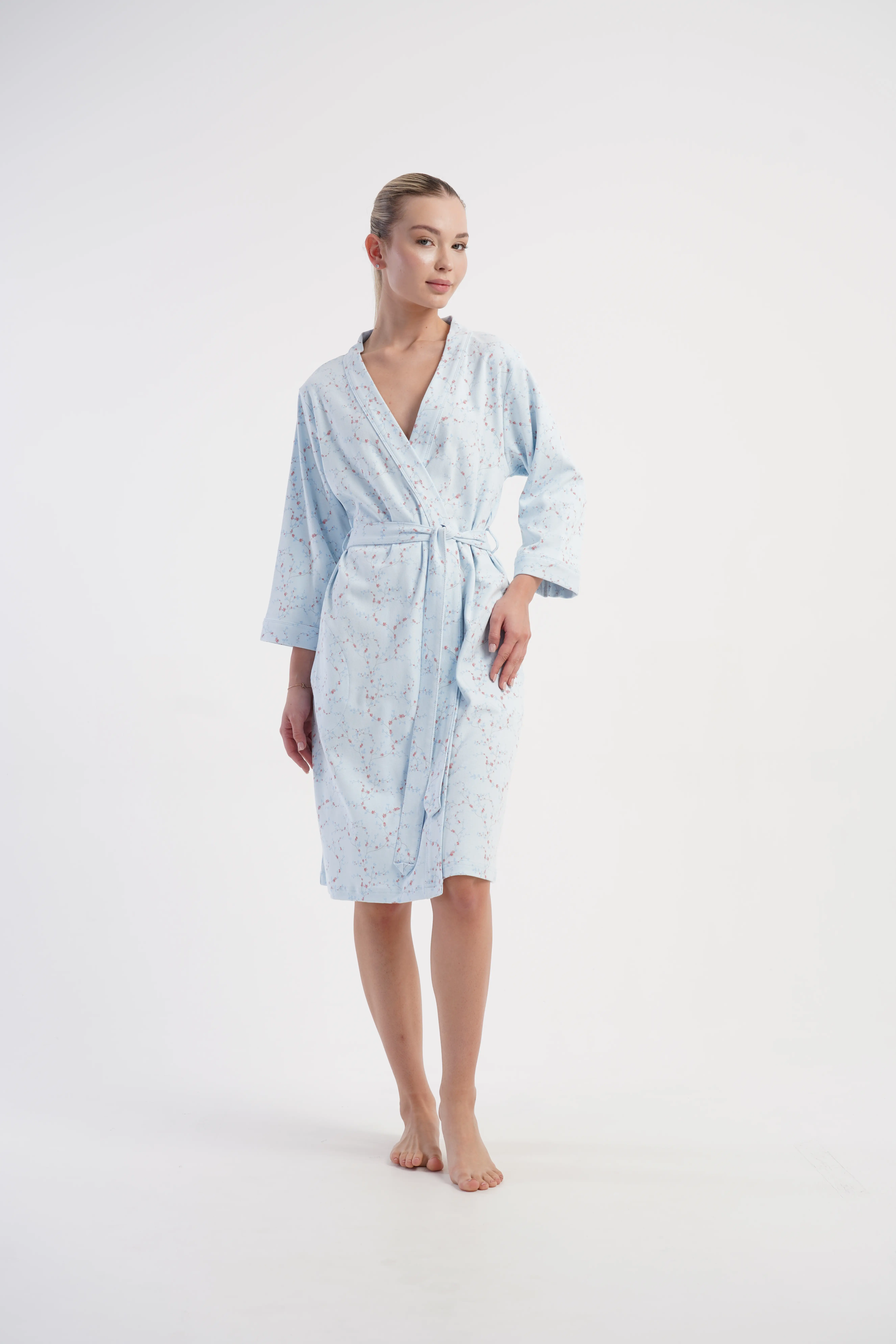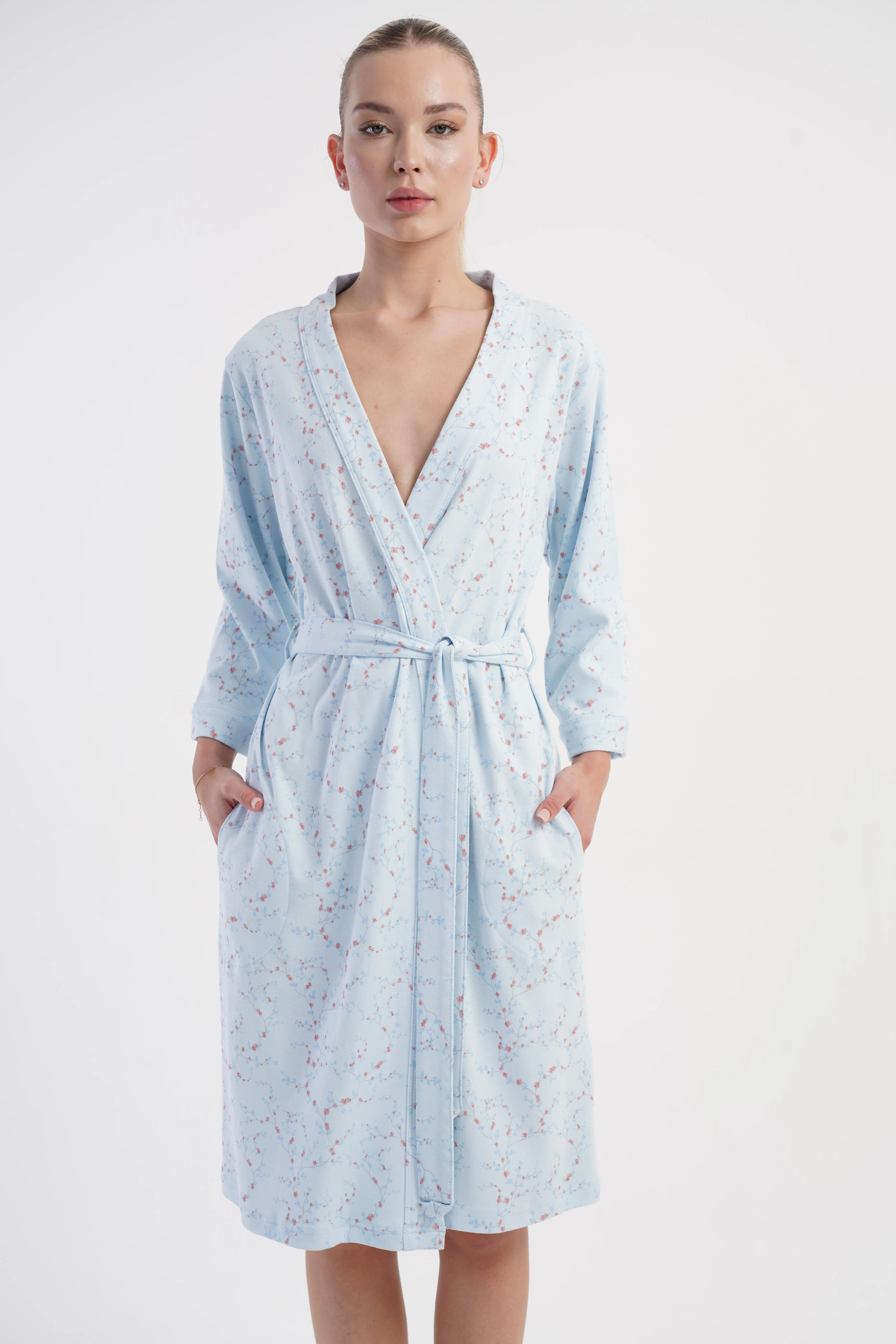 • Wiązany w pasie paskiem, z praktycznymi kieszeniami po bokach
