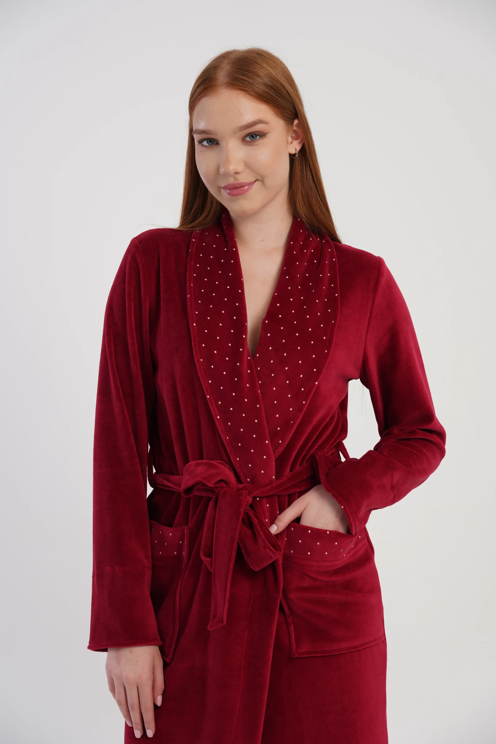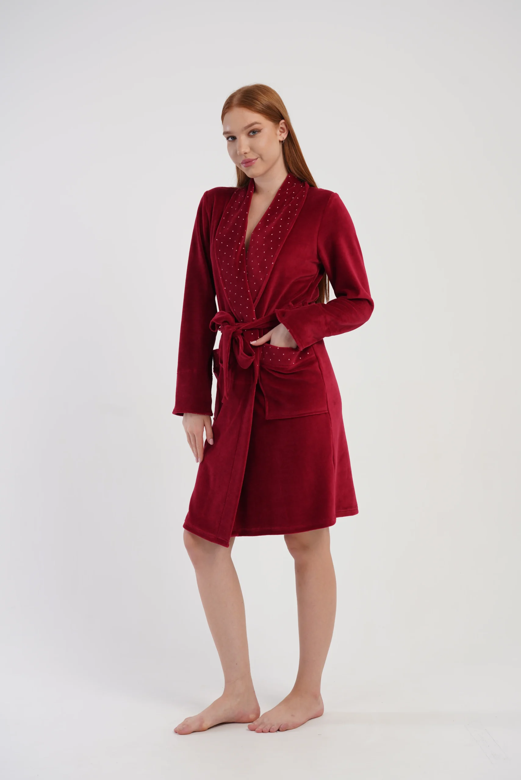 • bordowy welur z dekoracyjnymi kropeczkami